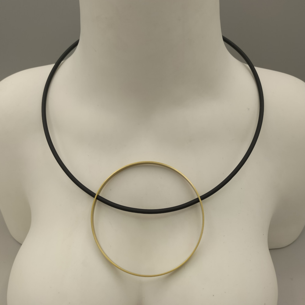 Choker necklaces made of brass and PVC. The design evokes Mother Earth, a circle symbolising gentleness that embraces the cosmos. Available in black, red and grey.